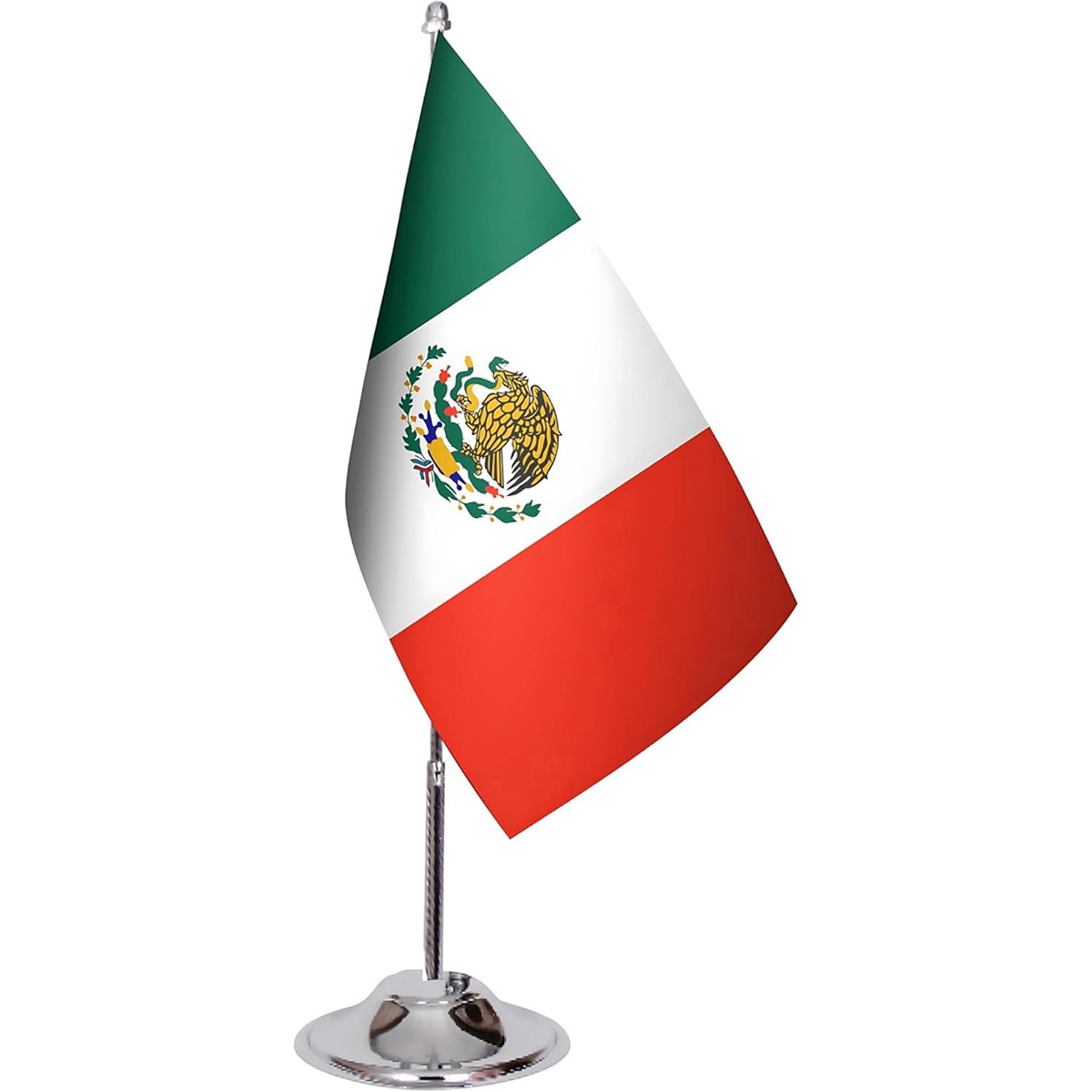 Mexican Desk Flag 5.9 x 8.9 Inch – Mexican Desk Flag with 13 Inch Chrome Pole and 3.07 Inch Base – Deluxe Satin Fabric