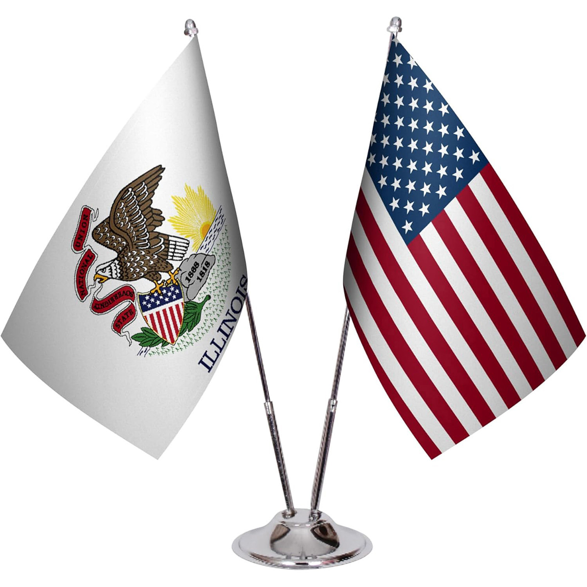 American & State Flag Desk Set – 6" x 9" Premium Satin Table Flags with Heavy Chrome Stand, Non-Tip Base (Illinois)