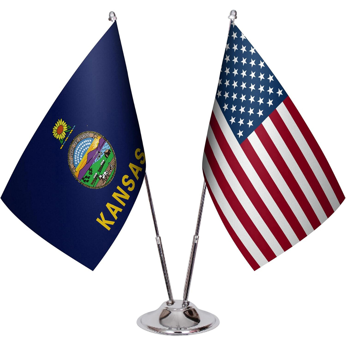 American & State Flag Desk Set – 6" x 9" Premium Satin Table Flags with Heavy Chrome Stand, Non-Tip Base (Kansas)