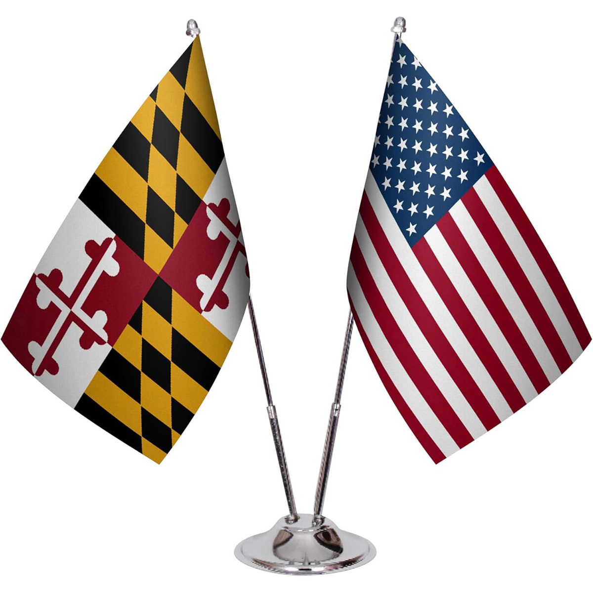 American & State Flag Desk Set – 6" x 9" Premium Satin Table Flags with Heavy Chrome Stand, Non-Tip Base (Maryland)