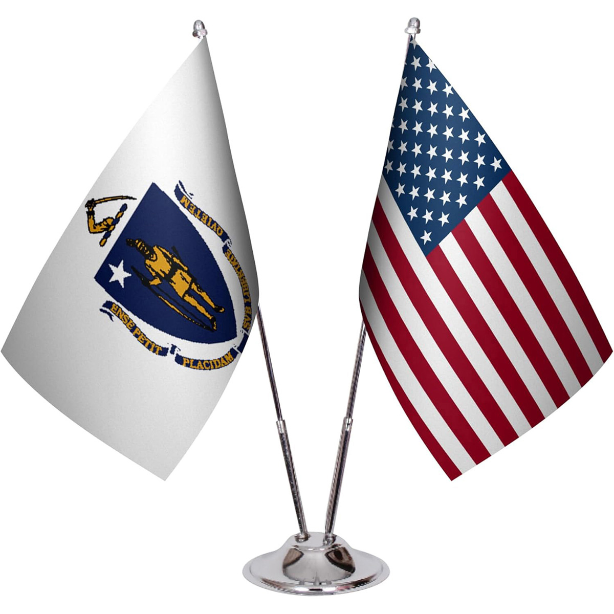 American & State Flag Desk Set – 6" x 9" Premium Satin Table Flags with Heavy Chrome Stand, Non-Tip Base (Massachusetts)