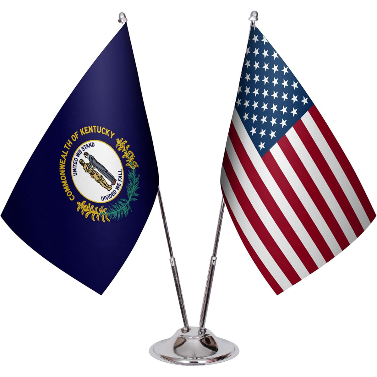 American & State Flag Desk Set – 6" x 9" Premium Satin Table Flags with Heavy Chrome Stand, Non-Tip Base (Kentucky)