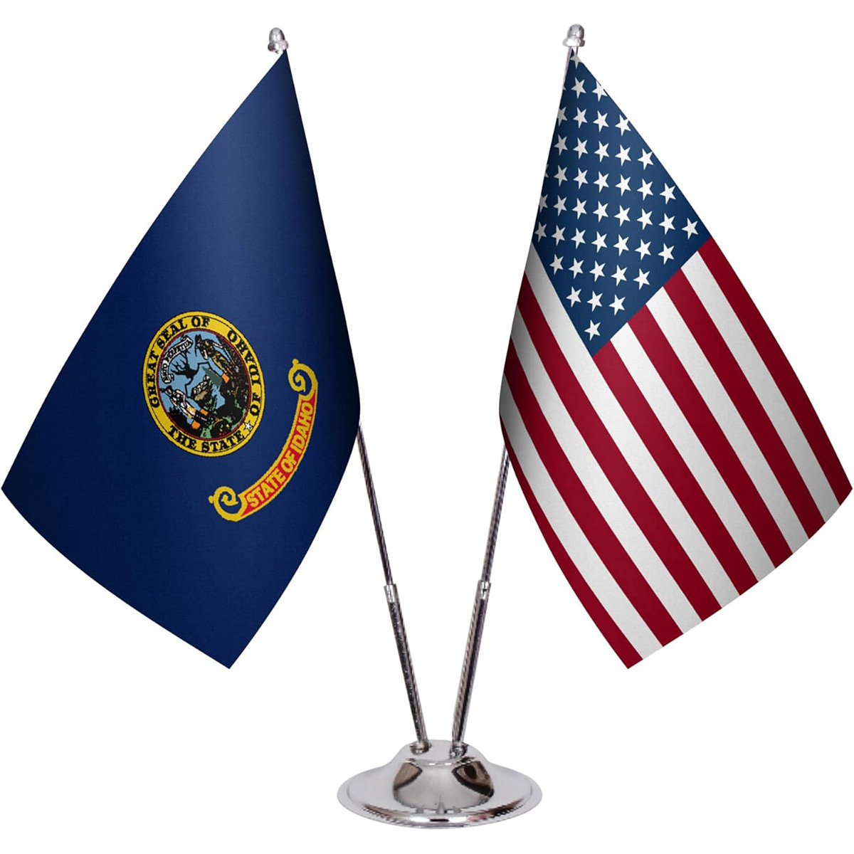 American & State Flag Desk Set – 6" x 9" Premium Satin Table Flags with Heavy Chrome Stand, Non-Tip Base (Idaho)