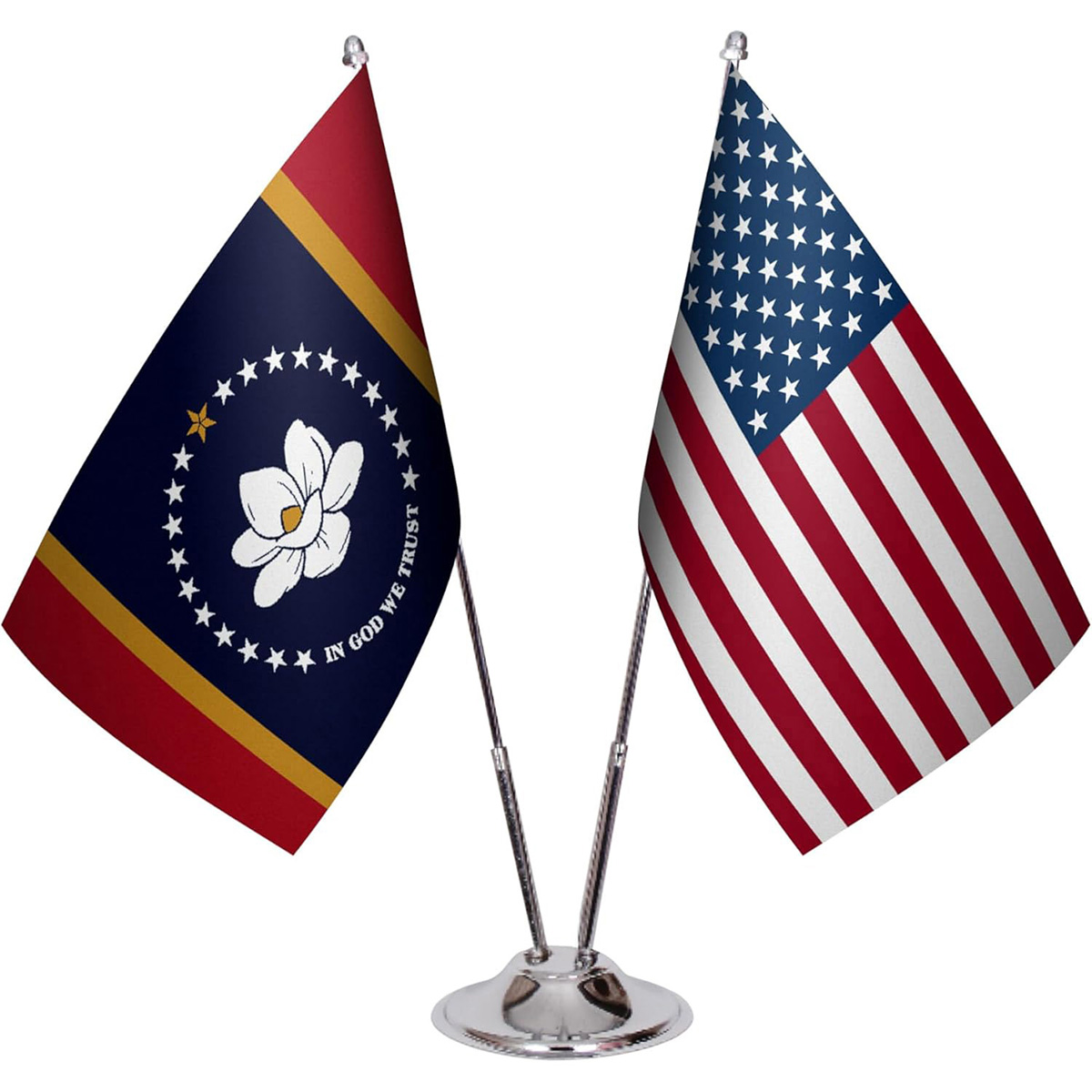 American & State Flag Desk Set – 6" x 9" Premium Satin Table Flags with Heavy Chrome Stand, Non-Tip Base (Mississippi)