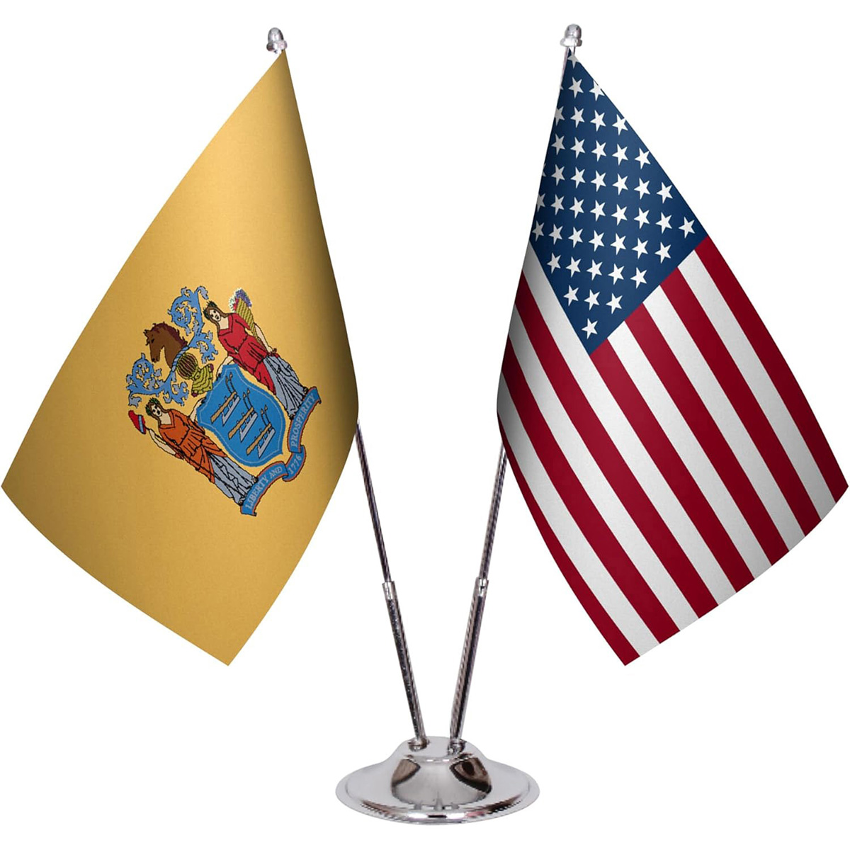 American & State Flag Desk Set – 6" x 9" Premium Satin Table Flags with Heavy Chrome Stand, Non-Tip Base (New Jersey)