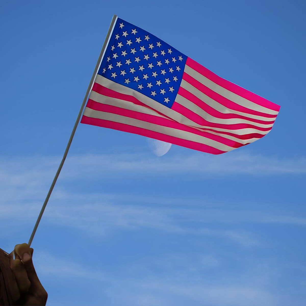 10 Pack 18 x 12 Inch American Flags on Stick – Heavy Duty Rashel Fabric, Handheld USA Flags for Memorial Day, Parades, Patriotic Decorations