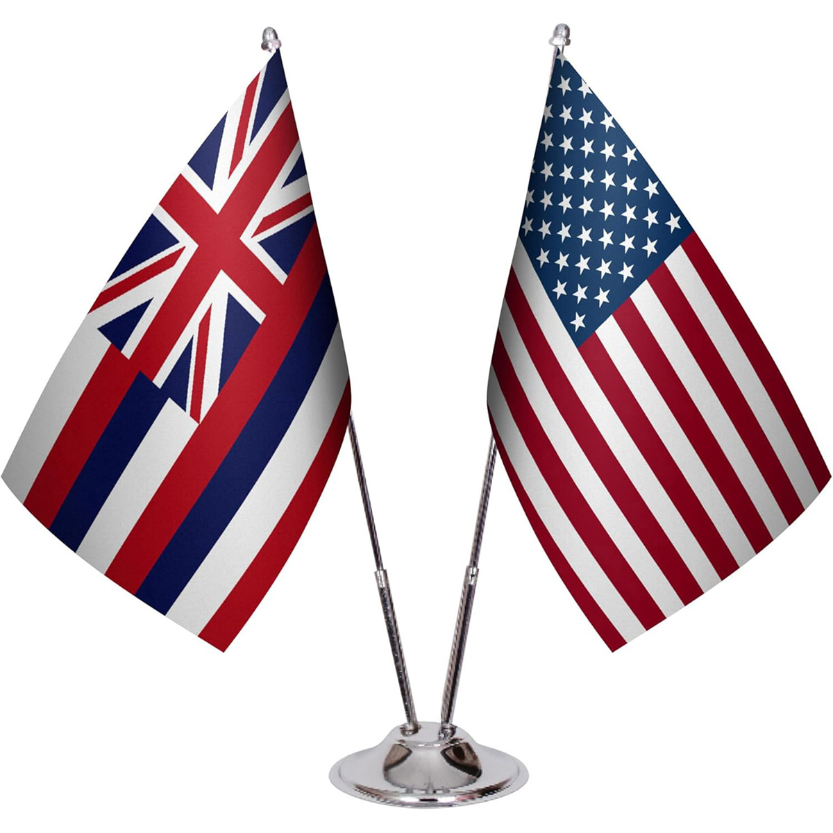 American & State Flag Desk Set – 6" x 9" Premium Satin Table Flags with Heavy Chrome Stand, Non-Tip Base (Hawaii)