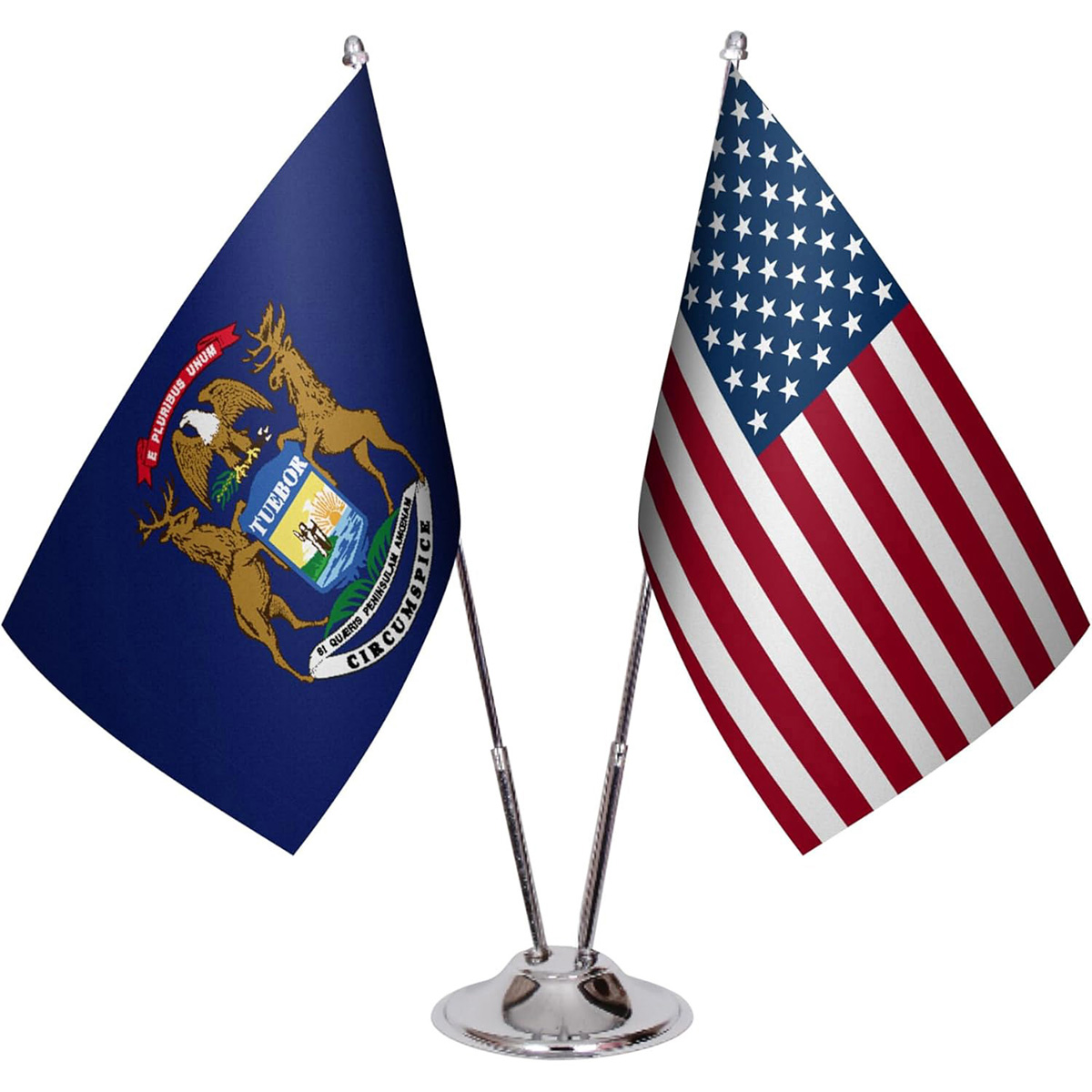 American & State Flag Desk Set – 6" x 9" Premium Satin Table Flags with Heavy Chrome Stand, Non-Tip Base (Michigan)