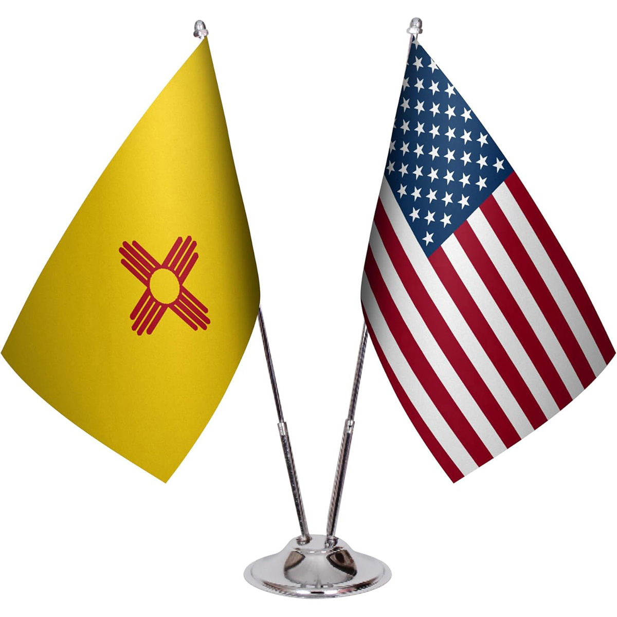 American & State Flag Desk Set – 6" x 9" Premium Satin Table Flags with Heavy Chrome Stand, Non-Tip Base (New Mexico)
