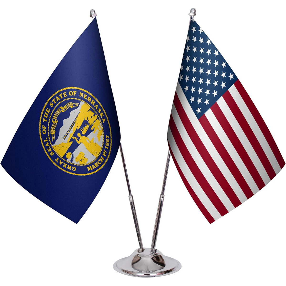 American & State Flag Desk Set – 6" x 9" Premium Satin Table Flags with Heavy Chrome Stand, Non-Tip Base (Nebraska)