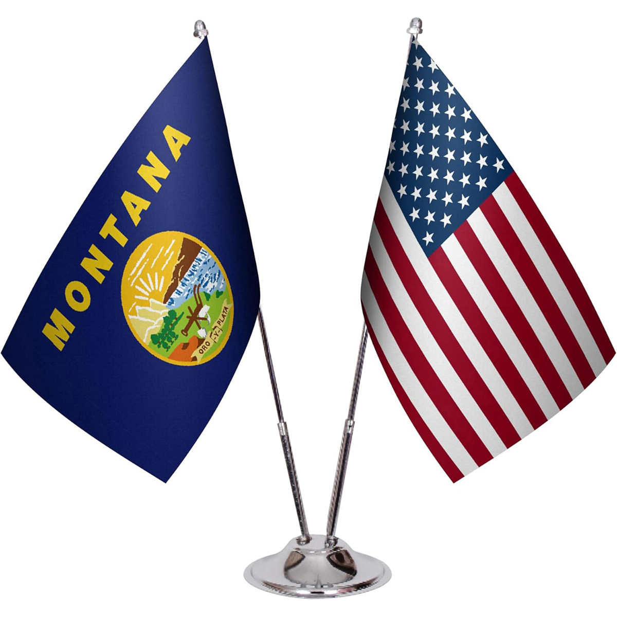 American & State Flag Desk Set – 6" x 9" Premium Satin Table Flags with Heavy Chrome Stand, Non-Tip Base (Montana)